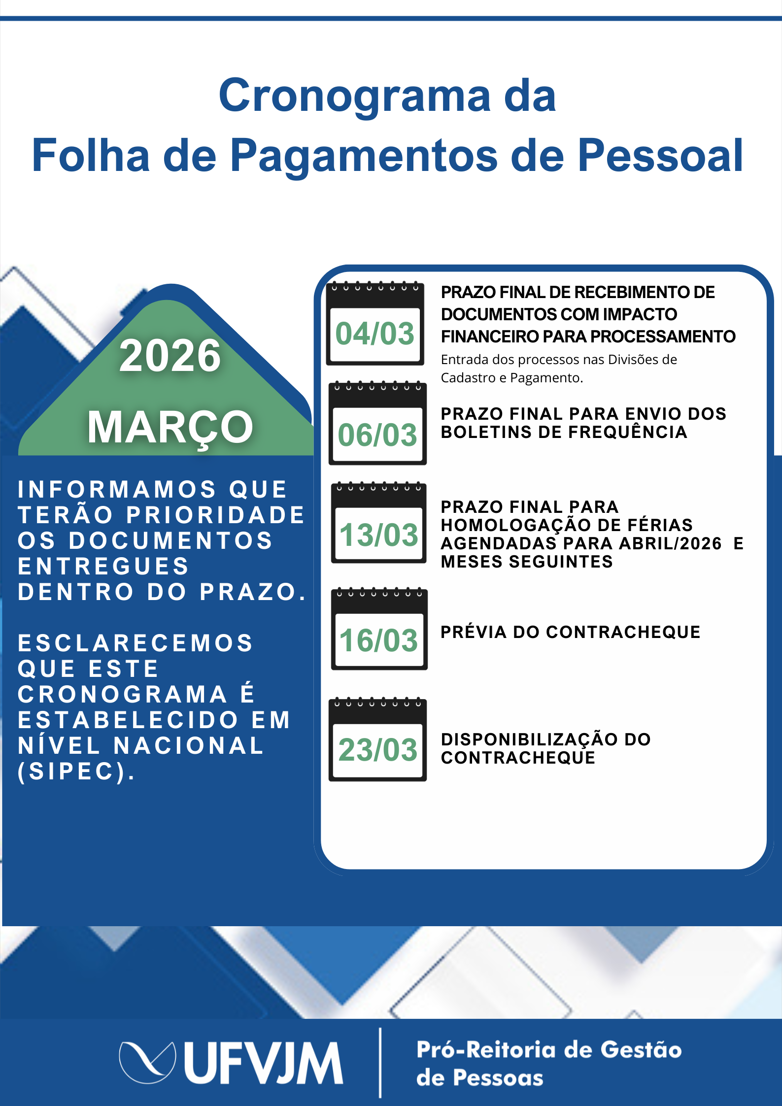 Cronograma da Folha de Pagamento - Março de 2026