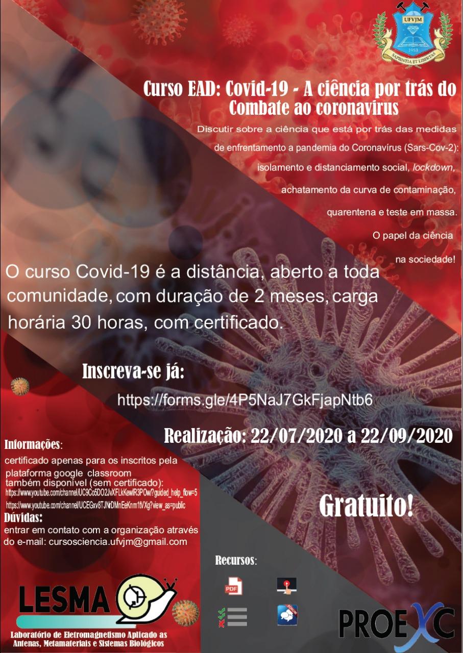 Descrição: O presente curso tem como objetivo elucidar, a luz da ciência, a importância das medidas de combate ao Covid-19, e tratar de temas correlatos, tais como: como o uso de mascaras caseiras funcionam como barreira física contra a contaminação, como é medida a eficiência do distanciamento social, a estatística da transmissibilidade do Coronavírus; entre outros.