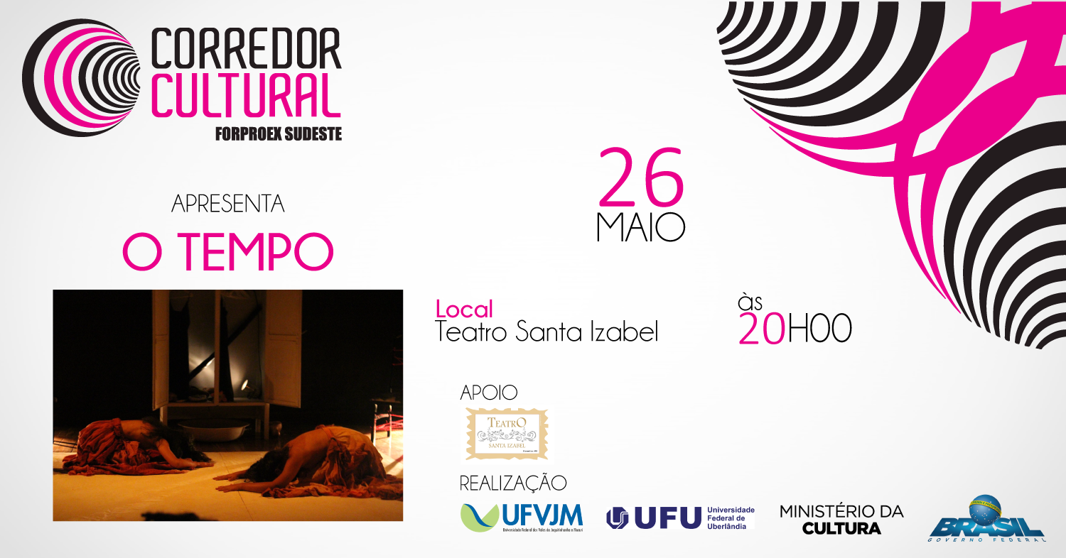 A Pró-Reitoria de Extensão e Cultura (Proexc) tem o prazer de convidar as comunidades interna e externa à UFVJM para a apresentação, pela primeira vez, da atividade do Corredor Cultural, com a peça intitulada “O Tempo”, do Grupo “Teatro Solúvel”.