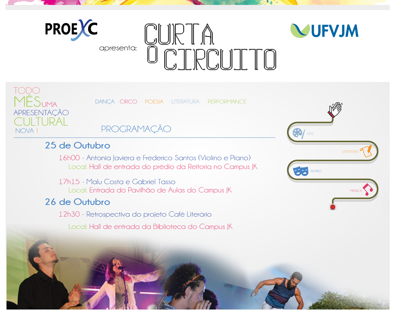 O “Curta o Circuito” será nos dias 25 de outubro, com a apresentação da dupla Antonia Javiera (Violino) e Frederico Santos (Piano), e a cantora de samba e MPB, Malu Costa e o violonista, Gabriel Tasso. Já no dia 26, haverá uma retrospectiva do projeto Café Literário.