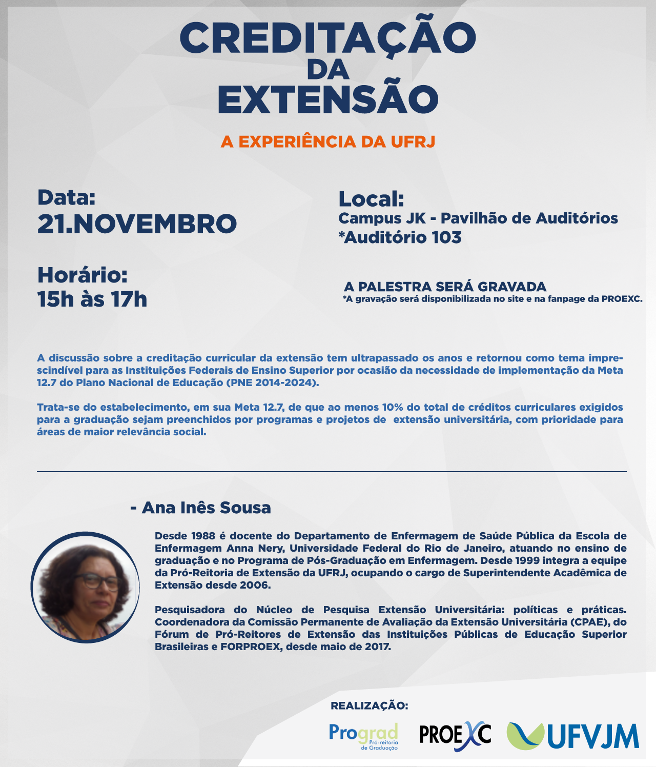 A Pró-Reitoria de Extensão e Cultura da UFVJM, em parceria com a Pró-Reitoria de Graduação, convida os Coordenadores de Cursos da UFVJM para a palestra intitulada "Creditação da Extensão: a experiência da UFRJ", que será ministrada pela Professora Ana Inês Souza, docente da Universidade Federal do Rio de Janeiro, pesquisadora do Núcleo de Extensão Universitária.
