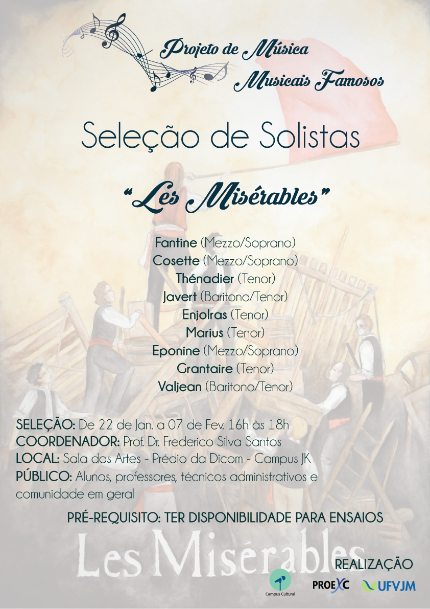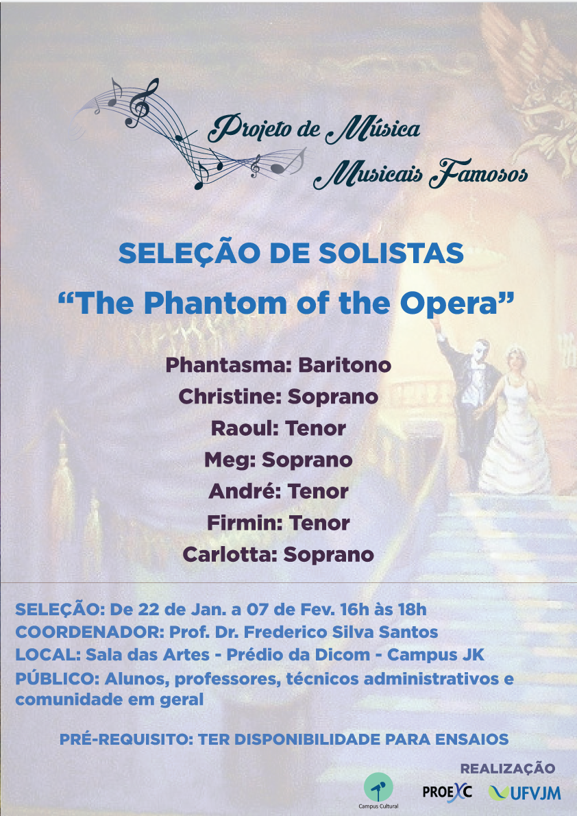 O projeto, “Musicais Famosos, busca estimular e contribuir para a boa convivência entre alunos, professores, técnicos administrativos e comunidade em geral, através da proposição de interdisciplinaridade entre a comunidade acadêmica da UFVJM e público externo. O projeto terá início com dois musicais - O Fantasma da Ópera e Os Miseráveis - por apresentarem em sua composição canções conhecidas e que possuem uma considerável aceitação do público em geral. Nesse sentido, a Proexc, através da Diretoria de Cultura, apresentará os musicais, no formato concerto, em diferentes espaços da instituição e das cidades onde a universidade está atuando,promovendo uma interação entre comunidade UFVJM e população de Diamantina, Janaúba, Teófilo Otoni e Unaí.