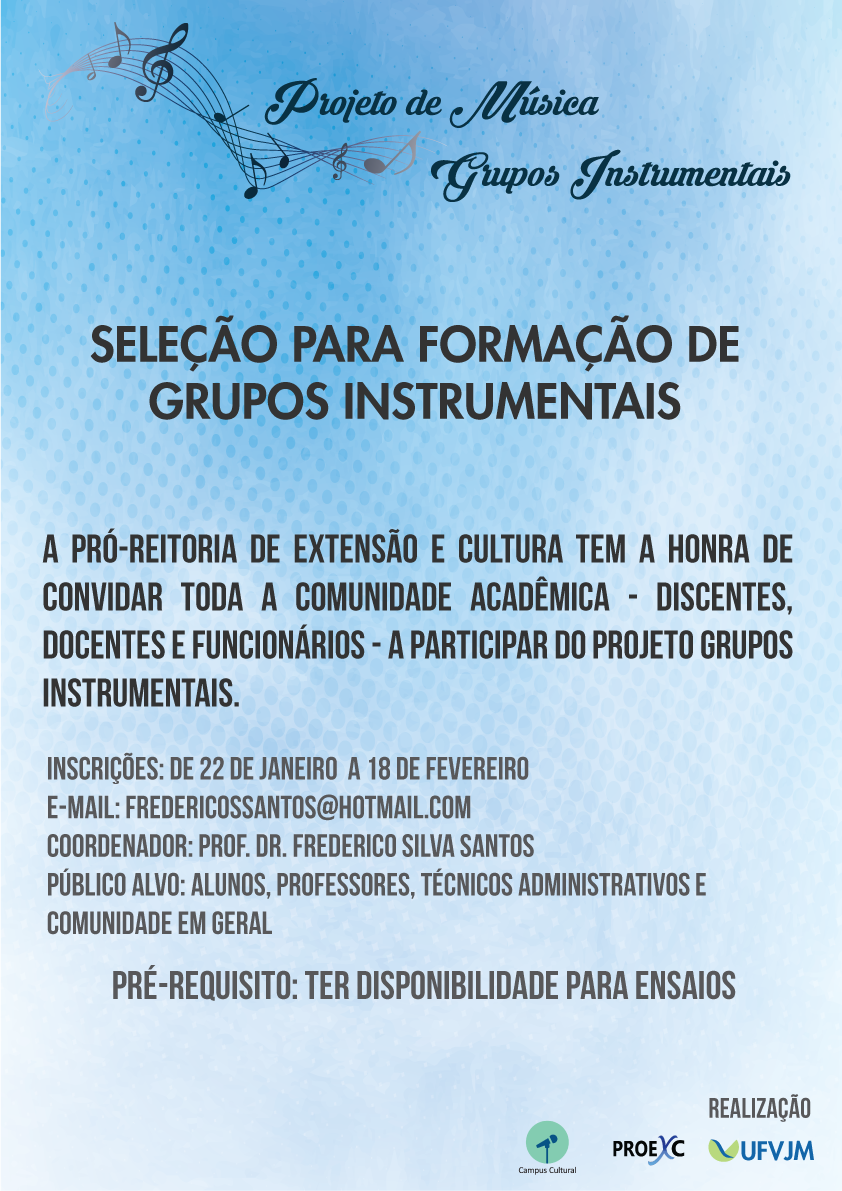 O projeto, “Grupos Instrumentais”, é uma proposta para fomentar diferentes formações instrumentais a partir da expertise de alunos, professores e técnicos administrativos. O projeto terá, inicialmente, três etapas: 1ª - Cadastro de instrumentistas; 2ª - Proposta de formação de conjuntos; 3ª - Propostas de repertório a ser trabalhado. A partir das especificidades de cada grupo constituído, serão convidados profissionais de áreas específicas para serem colaboradores das atividades técnicas. Esperamos a formação de grupos diversos como camerata de violões, grupo de cordas, grupo de metais, grupos de percussão, duos, trios e bandas etc.