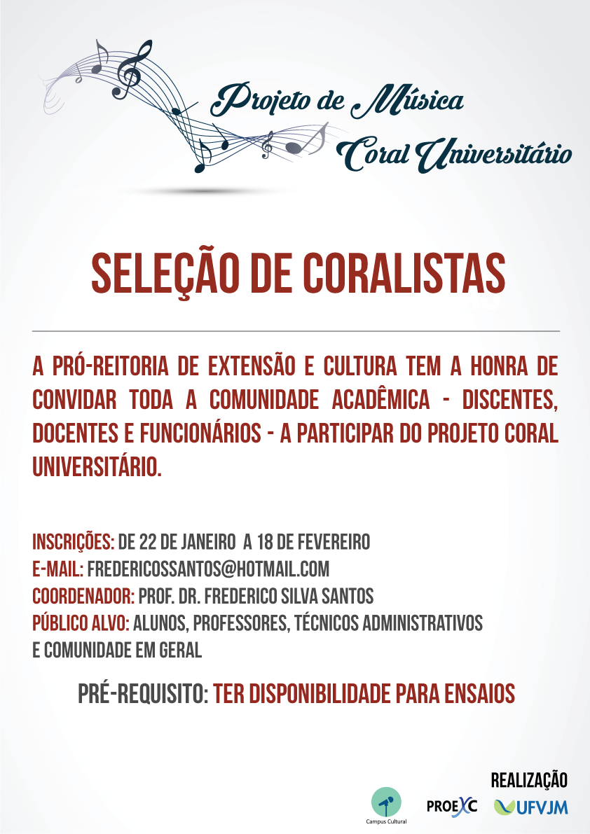 O projeto, “Coral Universitário”, apresenta papel fundamental na socialização dos envolvidos, além de trabalhar elementos técnicos como entonação, gestos, olhar, articulação das palavras, controle da inibição, controle do medo de falar em público, postura corporal e vocal, e, sobretudo a respiração, elementos imprescindíveis na formação de bons profissionais, independente da área de formação. O projeto é aberto a toda comunidade acadêmica e externa. Os interessados deverão se inscrever e em seguida serão submetidos a uma seleção e classificação de suas vozes de acordo com os naipes vocais.