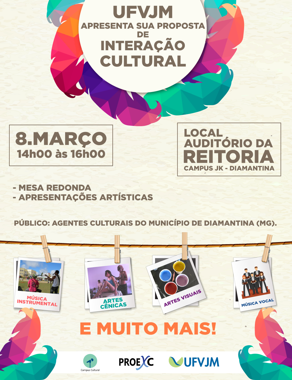A Universidade Federal dos Vales do Jequitinhonha e Mucuri (UFVJM), através da Pró-Reitoria de Extensão e Cultura (Proexc),realizará no próximo dia 8 de março, um encontro de interação cultural com os agentes ligados à área de cultura do município de Diamantina. O objetivo é apresentar a proposta da universidade para a formação e profissionalização de grupos artísticos na instituição e na região onde está inserida.