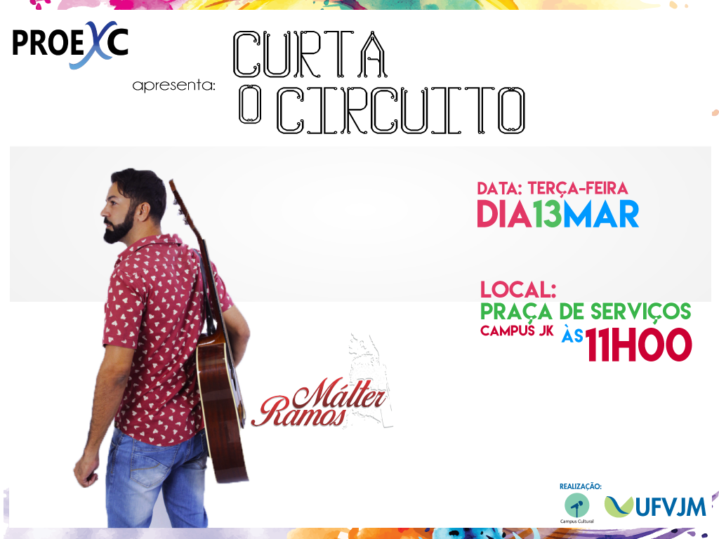 Na próxima terça-feira, dia 13 de março, a Pró-Reitoria de Extensão e Cultura (Proexc), através da Diretoria de Cultura, retoma as atividades do programa "Curta o Cicuito" com a apresentação do cantor Malter Ramos, que trará um repertório bem variado de música brasileira. Toda a comunidade acadêmica está convidada a prestigiar o músico que se apresentará, na Praça de Serviços do Campus JK, em Diamantina, às 11h00.