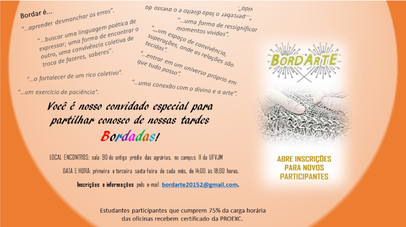 Estão abertas as inscrições para participantes do projeto Bordarte, que faz parte do Programa de Bolsas de Apoio à Cultura e a Arte (Procarte) da Pró-Reitoria de Extensão e Cultura (Proexc) da UFVJM. O grupo foi criado em 2015 e, desde então, realiza encontros quinzenais para a prática do bordado e artes afins.