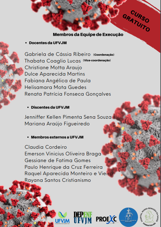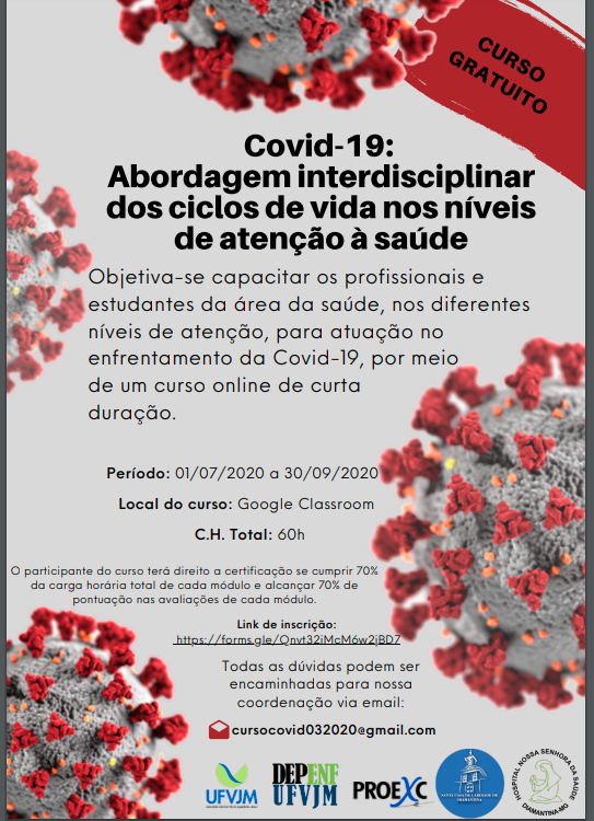 O curso online “Covid-19: Abordagem interdisciplinar dos ciclos de vida nos níveis de atenção à saúde” terá como público alvo os profissionais, estudantes de graduação e pós-graduação da área da saúde. A carga horária total do curso é de 60 horas e emissão de certificado. Para saber de novas informações acompanhe a página do Instagram (@enfufvjm). A inscrição poderá ser realizada clicando aqui.