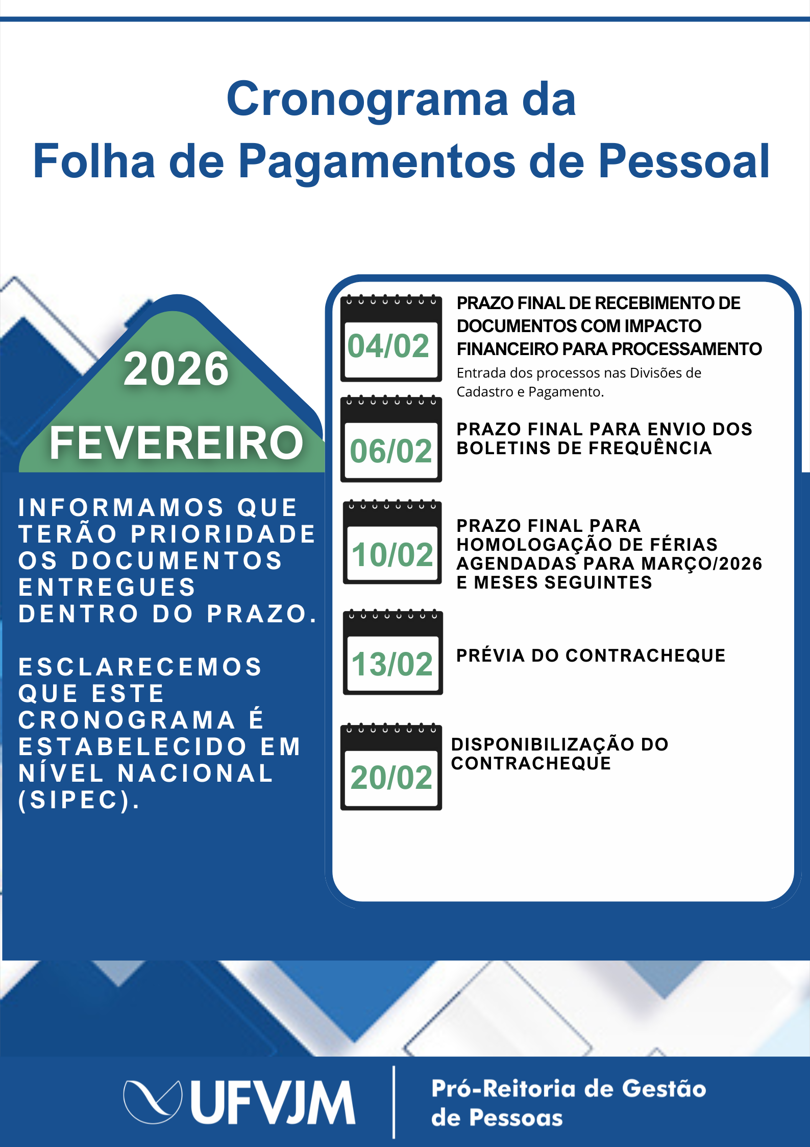 Cronograma da Folha de Pagamento - Fevereiro de 2026